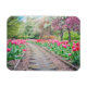 Featuring a flower garden filled with red tulips on either side of a stone and gravel walkway. The blooming trees in the background add to the spring time theme of the whole design.