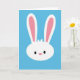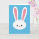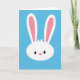 The front design shows a stylized white bunny head centered on a wide cerulean-blue background 🐰. Two long ears curve upward, and their inner sections are tinted a gentle pink that draws your gaze higher. Simple black oval eyes face forward with a calm, tender look, like it’s quietly sharing a sweet moment with someone just off-frame. A small pink oval nose sits low on the face, keeping the expression soft and friendly 🐇. The shapes stay smooth and flat with very little shading, giving the scene a tidy, graphic look. There’s no scenery beyond the solid blue field, so the bunny feels like it’s floating in open spring air. Near the top of the head, a tiny tuft-like hint of white fur breaks the smooth outline, and there’s no text anywhere on the design.
