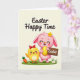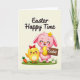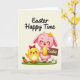 This design shows a spring-themed illustration with two cute, animated animal friends centered on a patch of green grass dotted with small white daisy-like flowers 🌷. A pink, long-eared bunny-like character stands in front, eyes closed with a tender smile, as if sharing a private, happy moment with its companion 🐰. A small yellow flower rests behind one ear, and it gently cradles a shiny golden egg decorated with white polka dots. Next to it is a fluffy yellow chick-like character with a bright red bow, looking up with wide, affectionate eyes toward the bunny-like figure. In one hand, the pink character holds a small wooden sign near its torso, and the sign carries a short Easter message in dark lettering. Above both characters, a larger line of dark text is centered near the top against a pale cream background. A bright orange carrot sits low in the grass near their feet, adding a warm pop of color in the foreground.