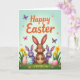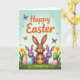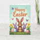 This design shows a warm brown rabbit standing in the middle with rosy cheeks and a gentle smile, while two smaller violet rabbits lean in close on either side as if sharing a quiet joke 🐰. Their wide eyes and softened expressions suggest affection and easy friendship, set against a patch of rich green grass. Around their feet sit several decorated eggs with pastel stripes, polka dots, and paint-like speckles, tucked among yellow trumpet-shaped flowers and small pink blooms 🌷. Near the top, large orange lettering stretches across the sky to announce the Easter theme, acting as the main headline. The background fades from soft aqua to pale mint, giving the scene a light spring morning look. A few small winged insects in plum and fuchsia drift through the open space, adding gentle motion above the characters. Subtle shading and smooth color transitions give the rabbits and eggs a softly rounded, almost touchable look. The orange headline sits high over a mint-to-aqua gradient sky while plum and fuchsia insects flutter nearby.