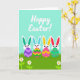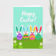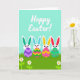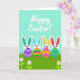 Designed with four round, white bunny-like creatures peeking from behind a row of decorated eggs, this Easter scene feels like a shared secret between friends 🐰. Each little face has dot eyes and a tiny pink nose, while the long ears are tipped in teal, sky blue, sunny yellow, and red, giving them a sweet, together-y look. A pale aqua sky fills the background, and near the top a seasonal greeting sits centered in flowing, cursive-style lettering in a darker teal. Below, an emerald green field stretches across the bottom, sprinkled with small white flowers with yellow centers 🌷. In the foreground, the eggs form a bright band of patterns—chevrons, stripes, and zigzags—layered so the bunnies seem to lean in close behind them. Colors across the eggs range from deep purple and fuchsia to lime green and orange, with each oval outlined clearly to stand out. The front design shows crisp geometric shapes on the eggs, set against the soft aqua sky and the green meadow dotted with tiny blossoms.