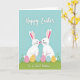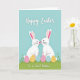 Designed with two stylized white rabbits standing nose-to-nose, the artwork shows a tender moment that reads like quiet friendship or a sweet crush 🐰. Their long upright ears have soft pink interiors, and their small noses are tinted rosy as they lean gently toward each other. Behind them is a pastel blue sky that keeps the scene airy and calm, while a rolling strip of green grass grounds the pair like a little hillside. Around their feet sit several decorated eggs, each with different patterns such as dots, stripes, and wavy lines in soft pink, sunny yellow, and pale blue 🌷. Across the top, a flowing seasonal greeting appears in a dark, easy-to-read color, centered above the rabbits. Near the bottom, a shorter dedication line sits in smaller lettering, aligned neatly along the lower edge. The eggs cluster along the grass in a loose semicircle, with alternating colors and patterns that frame the rabbits.