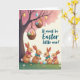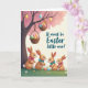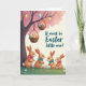 This design shows a spring meadow scene with four long-eared, bunny-like friends in warm brown tones gathered close together, their rosy cheeks and bright eyes turned toward one another with an affectionate, friendly focus 🐰. Each wears a small bow in soft pink or teal, adding a gentle pop of color against their fur as they nudge and point at oval treats scattered in the grass. The ground is dotted with tiny wildflowers and fresh green blades, and the ovals on the meadow come in pastel shades like pink, yellow, and light blue. In the upper left, a tall tree stretches deep brown branches across the corner, with a blush-pink wash behind it that fades into a creamy white sky. Two woven baskets hang from the branches, filled with speckled pastel ovals, and a smaller bunny peeks out from one basket as if sharing a secret with the group 🐇. A short holiday greeting sits on the right side in teal lettering, standing out clearly against the light background. A few patterned ovals also dangle from the bare branches above, like simple decorations swaying over the scene.