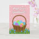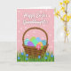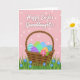 Designed with a springtime scene, the card shows a textured brown woven basket resting in layered green grass, with a cozy, togetherness feel as the eggs nestle close like friends gathered in one place 🐰. The basket is filled with pastel eggs in soft aquamarine, light lavender, lime green, sky blue, and warm apricot. Several eggs carry simple patterns like wavy lines and neat stripes, adding movement without crowding the scene. A five-petaled pink flower with a fresh green leaf sits tucked against the basket, like a small token set there with care 🌷. Small blue wildflowers with yellow centers dot the grass around the basket, guiding your eye across the bottom edge. The background is blush pink with faint, lighter polka dots scattered across it for a gentle, airy look. Near the top, the greeting appears in white cursive lettering with a soft shadow, centered and easy to spot against the pink. The basket’s rim and weave lines are shaded to look slightly raised, and the eggs catch tiny highlights along their curved edges.