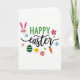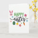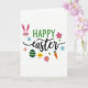 This card features a white background with “HAPPY” set near the top in green uppercase letters, edged with a dashed outline, and “Easter” written larger beneath it in flowing black lettering. A small bunny with pink inner ears and rosy cheeks peeks in from the upper left, giving the scene a shy, friendly feel 🐰. Soft pink and light blue flowers are sprinkled around the words like little notes passed between friends. Near the lower left, a green-striped egg shape adds a steady base to the layout. A tiny yellow chick with an orange beak and feet stands nearby as if keeping cheerful company 🐇. On the right side, a slim orange carrot with a leafy green top leans inward, as though it’s joining the group. The black “Easter” stretches across the middle while the green “HAPPY” sits above it, with blossoms and small icons spaced around them on the white field.