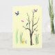 This note card creates a colorful, whimsical spring mood. Birds are flying and are perched in the tree. Butterflies hover in the warm air. A duck waddles in the grass. There is even a tiny snail on the ground. The design is repeated inside.