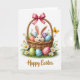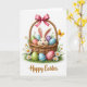 This card shows a bright spring scene on a white background, centered on a woven basket tied with a pink-and-white striped bow. A cheerful long-eared bunny peeks out with a wide smile and gentle eyes, as if sharing a sweet moment with whoever is holding the card 🐰. The basket is filled with decorated eggs in soft pastel shades, patterned with zigzags, stripes, and dots in light blue, pink, green, and purple. A few eggs spill down onto a patch of green grass, where small white daisies with yellow centers sit like little accents around the base 🌷. Near the upper right, a small golden-winged insect hovers, adding a light sense of motion to the still scene. Along the bottom edge, a short greeting is placed in flowing lettering in a warm peachy tone, standing out gently against the white. The basket’s braided texture, the bunny’s fluffy look, and the eggs’ smooth shine are all clearly drawn under soft, even lighting, with the golden-winged insect hovering near the top right corner.