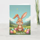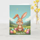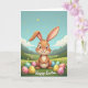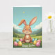 This card shows a long-eared bunny in soft caramel and cream tones sitting in the center, with paws gently clasped as if pausing to share a quiet moment 🐰. Its big, glossy eyes and small buck-toothed smile face forward, giving the scene a friendly, affectionate look. In the green grass around it, patterned oval eggs in pink, yellow, mint, and sky blue are scattered like little gifts waiting to be found 🌷. Tiny blossoms dot the ground, adding a sweet, garden-like setting that feels made for close company. Behind the bunny, low rolling hills fade into muted mountains under a wide blue sky, keeping the background calm and open. Small golden orbs drift across the sky like soft sparkles, adding a gentle glow without overpowering the scene. A short greeting in flowing lettering sits along the bottom edge in a darker contrasting color for easy reading. The eggs feature polka dots and star shapes, and the grass is shaded with rich greens and lighter highlights.