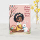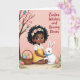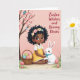This greeting card features a dark-skinned child with rosy cheeks and curly dark hair, topped with small pastel flowers, wearing a white shirt and sunny yellow dress as she leans close to a fluffy white long-eared bunny with a neat blue bow 🐰. Her gentle hands and the bunny’s calm, trusting gaze create a quiet, affectionate moment that reads like close friendship. The background is a soft pink wash, like a spring sky, keeping the scene light and airy. On the left side, a flowering tree with pink blossoms and tiny pale buds holds a small blue bird perched among the branches 🌷. Along the bottom, green grass frames pastel-patterned eggs scattered as if mid-search, with a woven basket nearby brimming with more decorated eggs. In the upper right, the phrase “Easter Wishes and Bunny Kisses” appears in flowing lettering, set in a coordinating pastel tone that stands out against the pink. The child and bunny sit slightly right of center, with the tree balancing the left side and the eggs leading your eye across the foreground. The bunny’s blue bow is crisp against its white fur, and the eggs show soft stripes, dots, and swirls in gentle spring colors.