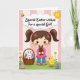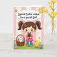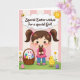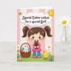 Designed with a sweet spring scene, the front shows a young girl with rosy cheeks and dark pigtails tied with pink bows, smiling down at a small chocolate-brown animal figure she cradles close like a treasured friend. Beside her sits a woven basket filled with decorated egg shapes, and a soft white long-eared bunny plush 🐰 tucked in as if it’s joining the moment. On the other side, a fluffy yellow chick stands calmly, adding a gentle companion feel to the group. The background is made of pale pink and cream vertical stripes, giving the setting a soft, cozy backdrop. Near the top, a cloud-shaped banner holds the greeting text in a darker contrasting color, with a tiny flying insect nearby and a bright sun peeking in 🌷. Along the bottom, green grass is dotted with small white flowers and scattered pastel eggs. The girl’s pink bows and the pastel eggs echo the light pink tones in the striped background.