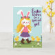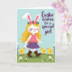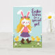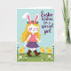 Designed with a springtime illustration, the card shows a stylized girl with long golden hair and tall white bunny ears walking through a soft green field 🐰. A small ring of pink blossoms rests on her head, and her pink top and deep purple skirt sway as if she’s strolling toward someone she cares about. She wears brown lace-up boots, and her rosy cheeks and gentle wink suggest a friendly, flirty confidence. Close behind her, three round yellow chicks with tiny orange beaks and feet toddle along like loyal little companions 🐇. White-petaled daisies and fresh green shoots dot the ground, adding a sweet, shared-moment feel to the scene. On the right side, a flowing greeting in a dark tone is placed over the open sky, standing out against the pale blue background. Fine details like dashed stitching marks on her outfit and soft, fluffy textures on the chicks and tails are visible near the lower half of the design.