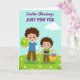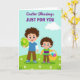 This greeting card shows two cartoon-style boys in a spring garden, sharing an easy closeness as they lean toward each other with bright, friendly smiles 🐰. The taller boy has tousled brown hair and holds up a large green oval decorated with small yellow flowers, as if proudly showing it to his companion. Next to him, the smaller boy cradles a woven golden basket filled with many patterned ovals in purple, yellow, and other cheerful colors, and his gaze seems fixed on what the other boy is holding. They stand on rich green grass scattered with tiny white and yellow blooms, giving the scene a fresh, just-bloomed look 🌷. The background is a smooth light-blue sky that keeps the focus on the pair and their shared activity. A short greeting line sits at the top center in purple lettering, spaced neatly above their heads. One soft white cloud floats near the upper right of the sky.