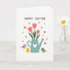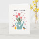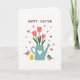 The front design shows a spring-themed illustration on a white background, with dark lettering placed near the top in a simple, festive style. In the center sits a soft teal watering can with a heart-shaped opening, suggesting a caring gesture like a small gift between close friends. Three pink tulip-like flowers rise from the can, their green stems tall and neat, adding a gentle garden feel 🌷. On either side, two round little birds perch facing inward, as if sharing a quiet moment together—one is pink with light blue wing accents, and the other is blue with a warm orange chest. A golden egg rests nearby, adding an Easter detail without crowding the scene 🐇. Small red hearts float above and around the flowers and birds, like tiny notes of affection drifting through the air. The hearts are scattered in different sizes near the upper area, with the teal can and pink blooms remaining the main focus.