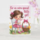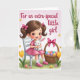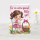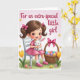 This card shows a sweet spring scene with a young girl in a pink dress, dark pigtails tied with fuchsia bows, and warm brown eyes that seem to linger fondly on a cuddly white long-eared plush 🐰. She sits on a white slatted chair, holding her plush close as if sharing a quiet, friendly moment. Nearby, a rustic woven basket tied with a pink ribbon is filled with pastel decorated eggs, adding soft color and a gentle celebratory touch. Green grass stretches across the bottom, sprinkled with patterned eggs and golden yellow tulips 🌷 that lean toward the girl and her companion. A few small yellow butterflies drift through the background, which fades from blush pink to white in a light gradient. A short greeting appears near the top in a thin, flowing style, set in a soft gray tone that stands out against the pale sky. The basket’s pink ribbon loops neatly over the rim, and the eggs show tiny dots and stripes in pastel shades.