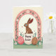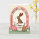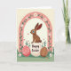 Designed with a softly arched coral-pink frame, this spring scene centers on a brown bunny perched on a large pale egg, its long ears showing warm pink inside and its bright blue eyes looking gently forward 🐰. Small red hearts float nearby, adding a sweet, friendly romance to the way the bunny seems to lean in as if posing for someone it cares about. Around the arch, curling green vines and small white five-petal flowers trail upward, creating a garden-like setting. Near the bottom, three decorated eggs sit among sparse green sprigs and tiny white blooms, arranged like a little display. The middle egg carries the greeting text across its front in deep red lettering, placed centrally and easy to spot. On the left, a rose-pink egg shows simple white face-like marks, while the right egg is brown with light stripes for a cozy, earthy contrast 🐇. The overall colors stay in soft off-whites, blush pinks, and leafy greens, with the red hearts and red text standing out inside the coral arch. The arch border is topped with a cluster of white blossoms and winding vines that curve neatly along the frame.