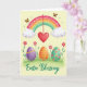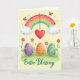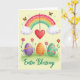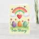 This design shows a spring scene on a soft cream background, with a wide arc of bright colors stretching across the top between two puffy white clouds. From the top of the arc, a shiny red heart hangs on a thin red string, like a small token meant for someone close. Two tiny winged creatures with golden-orange wings flutter nearby, angled toward each other as if sharing a teasing, affectionate chase 🐇. Below, a curved patch of rich green grass holds three decorated egg shapes, arranged side by side like friends gathered for a photo. One egg is deep purple with small white dots and a gold band, the next is orange with zigzag lines and gold accents, and the third is teal with little orange and pink flowers and fine green leaves 🌷. Slender pink flowers rise from the grass, adding soft pops of color around the eggs. Along the bottom edge, a flowing line of lettering sits centered in a dark tone, with the red heart and rainbow arc glowing above it.