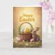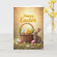 This design shows a soft-furred bunny with tall ears sitting close to a woven basket, its head slightly tilted as it looks into a warm, glowing background 🐰. The bunny’s gentle gaze and relaxed posture give the scene a tender, companionable feel, as if it’s quietly sharing the moment with someone nearby. Inside the basket are pastel eggs in light blue, pale pink, and creamy off-white, tucked among fresh green leaves. A tiny yellow chick peeks out between the eggs, adding a sweet touch of new life and closeness 🌷. The ground is a thick patch of green grass sprinkled with small white and pink flowers, with a few more pastel eggs scattered in the foreground. Across the top, a flowing line of lettering in a dark, high-contrast color sits against the bright, sunlit blur, standing out clearly. The background fades into golden bokeh circles, while the fur texture, basket weave, and faint speckles on the eggshells stay in sharp focus.