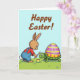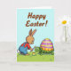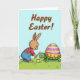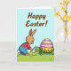 This greeting card shows a brown, long-eared bunny in blue overalls and a red shirt leaning close with a careful, affectionate focus as it paints on the back of a friendly green-shelled turtle 🐰. The bunny holds a small paintbrush mid-stroke, and the turtle sits calmly as if enjoying the shared attention, turning the moment into a quiet gesture of friendship. Across the top, rounded uppercase text in a warm earthy brown spells out a classic Easter greeting, centered and easy to read. The turtle’s shell becomes the main canvas, wrapped in yellow and purple bands and dotted with pink hearts that suggest a sweet bond between the two characters 🐇. A small yellow paint pot sits nearby, adding to the sense that the decorating is still in progress. The ground is a bright green field with a few simple blades of grass scattered around their feet. Behind them, the background is a wide sky-blue space that keeps the focus on their gentle teamwork. The bunny’s brush tip touches the shell just above a row of pink hearts, with the yellow paint pot placed slightly to the side on the grass.