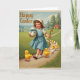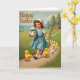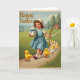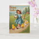 Designed with a gentle spring scene, the card shows a smiling young girl with rosy cheeks in a pale blue dress and a light bonnet strolling along a winding country path. She holds a curved staff in one hand as if leading the way, while her other arm hugs a large white egg tied with a bright blue ribbon, like a gift meant for someone close. A small group of fluffy yellow-and-white chicks trail after her in a cozy little parade, their red beaks pointed forward as though they’re following a friend 🐰. Behind them, rolling green hills and tall evergreen trees frame a small cottage tucked into the greenery, adding a quiet, homey backdrop. Soft, diffused sunlight falls across the path and fields, giving the scene a tender, old-fashioned look that hints at warm companionship. The words “Happy Easter” sit at the top left in gold-toned lettering that stands out against the sky, with plenty of open space around it 🌷. Near the horizon, pale clouds float above the treetops while the cottage roof peeks out between dark green branches.