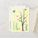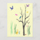 This postcard creates a colorful, whimsical spring mood. Birds are flying and are perched in the tree. Butterflies hover in the warm air. A duck waddles in the grass. There is even a tiny snail on the ground.