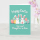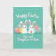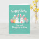 This design shows a teal background with two stylized white rabbits side by side, their gentle smiles and close posture suggesting friendship with a hint of romance 🐰. Soft pink fills their inner ears, and small facial details keep their expressions tender and calm. A small pink heart sits on one rabbit’s chest, like a quiet sign of affection between them. Around the pair are six decorated eggs in pastel pink, yellow, and blue, arranged to frame the rabbits without crowding them 🌷. Each egg has a different pattern—polka dots, wavy stripes, stars, and zigzags—adding variety while staying soft in tone. Near the top, a seasonal greeting appears in white lettering, with a smaller line beneath it naming the recipients, both set clearly against the teal. Light shadows sit under the rabbits, the eggs, and the white text, giving the flat scene a gentle sense of depth. The eggs show tiny dots, curved lines, and star shapes in alternating pastel bands.