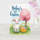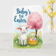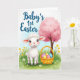 Designed with a sweet spring scene, the illustration centers on a young lamb with fluffy white wool, rosy cheeks, and wide shining eyes that seem to linger on the viewer with friendly affection 🐇. It stands in a green meadow sprinkled with small white and yellow flowers, giving the setting a fresh, just-bloomed look 🌷. Off to the right, a tall tree spreads a canopy of soft pink blossoms, its branches curving gently as if sheltering the little figure. Beneath the tree sits a woven basket filled with pastel eggs, each one decorated with tiny stripes, dots, and curving patterns that add variety without crowding the scene. The sky above fades from pale blue to even lighter tones near the horizon, bathing everything in soft daylight. A short Easter greeting is placed along the top in a flowing cursive style, printed in a light color that stands out against the sky. Soft greens, pinks, yellows, and blues keep the landscape calm and inviting, while the basket’s patterned eggs add small points of detail. The blossoms form a fluffy pink cloud above the basket, and the eggs show mint, lavender, and pale yellow accents.
