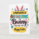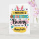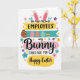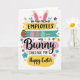 Designed with a bright spring look, this card features two long bunny ears at the top in soft pink and creamy beige, like a sweet little nod from a friend 🐰. Across the middle, several horizontal ribbon shapes in yellow, teal, and blush pink stack neatly, giving the layout a layered, banner-like feel. The main message is split over these ribbons, with larger uppercase lettering in a dark ink and smaller flowing lettering in a coordinating shade, centered so the words feel like they’re speaking directly to someone special. Beneath the text, four decorated eggs sit in a row, each with different patterns such as dots, speckles, stripes, and loose abstract marks that add a cozy, affectionate tone. Small flowers and star shapes drift around the eggs and ribbons, as if sprinkled there to echo a gentle, caring connection 🌷. The background stays plain white so every color and shape stands out without feeling crowded. Tiny blossoms in purple, yellow, and teal are scattered near the corners, with a few small stars tucked between them and the eggs.