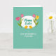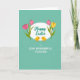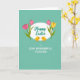 This greeting card features a spring-themed illustration set on a soft teal background, with a white oval frame centered like a gentle spotlight. Inside the oval, the main message appears in emerald green, written in flowing cursive-style lettering that feels friendly and affectionate. On either side of the oval sit four tulips 🌷—two pink and two yellow—with slim green stems and simple leaves that lean inward as if keeping the message company. Beneath the oval, two small yellow birds face one another, their bodies angled close with a tender, companionable look, like they’re sharing a quiet moment. Their beaks and feet are orange, adding warm little accents that echo the yellow flowers above. Lower on the card, a second line of text is set in uppercase letters, placed neatly under the birds in a darker green for contrast. The tulips are arranged symmetrically around the oval, while the two birds sit centered below, creating a balanced scene with a soft, friendly spring feel 🐇.