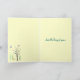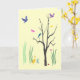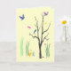 This friendship card creates a colorful, whimsical spring mood. Birds are flying and are perched in the tree. Butterflies hover in the warm air. A duck waddles in the grass. There is even a tiny snail on the ground. The design is repeated inside. The text reads: Just thinking of you... It can be customized to suit your needs.