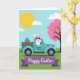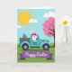 This greeting card shows a springtime scene with a vintage-style pickup truck painted teal, rolling through a green meadow under a bright blue sky. Behind the wheel sits a white bunny-like character with long ears lined in pink, rosy cheeks, and a pink bow, glancing ahead with a soft, friendly smile 🐰. The truck bed holds one decorated blue egg with swirling patterns, set in a rustic wooden frame like a treasured gift. In the upper left, a round yellow sun shines down while a few puffy white clouds drift nearby. On the right side, a tall tree bursts with pink blossoms, and the petals seem to echo the bunny’s bow for a sweet, affectionate touch 🌷. Across the top portion, a wide purple banner stretches horizontally with a holiday greeting printed in white, flowing lettering. The teal truck sits slightly left of center, with the patterned egg clearly visible above the side rail and the pink-blossomed tree filling the right edge.