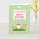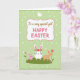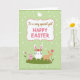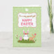 This greeting card centers on a white rectangular frame outlined in soft pink, with a short Easter message placed in the middle in brown lettering with a few words highlighted in hot pink. Above the text sits a simple white bird shape with a small orange beak, like a calm little sign of spring. Below the frame, a rounded green hill holds three long-eared friends 🐰, drawn close enough to suggest easy companionship. The largest white one stands in the center wearing a ring of red flowers and green leaves, while a smaller pink one leans nearby as if sharing the moment. On the right, a slim tan rabbit reaches toward a tall pink flower 🌷, its gentle pose reading like a quiet, affectionate gesture. The background is pale green with faint white dots scattered across it, and a darker green scalloped border runs all the way around the edge. A tall pink bloom rises beside the tan rabbit, with the red-and-green flower crown clearly visible on the white rabbit.