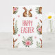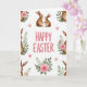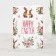 This card features a bright pink Easter greeting centered on a white background, with the words arranged in a large line across the middle and smaller lines tucked neatly beneath it. Around the text, small woodland animals with soft brown fur, round bodies, and rosy cheeks form a gentle border, creating a cozy scene that feels like friends gathering close 🐰. Near the top, two of the animals face each other with a tender look, and the smaller one reaches out a paw as if sharing a quiet, affectionate moment. Green leafy sprigs curl between them and the lettering, guiding your eye around the design like a soft frame. Soft pink rose-like blooms and white tulip-shaped flowers sit in clusters along the sides, with a few tiny five-petal blossoms scattered in the open space 🌷. The pink text stands out clearly against the white, while the surrounding florals use light greens, blush tones, and creamy whites to keep everything airy and gentle. A small pink heart floats near the upper area, nestled between the top pair and a spray of leaves and flowers.