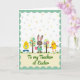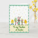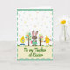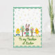 Designed with a soft mint-green scalloped border, the front features a bright white background sprinkled with tiny confetti dots that feel like a light spring shower 🌷. In the center, a friendly brown bunny in a simple green smock holds a pink egg with fine line patterns, leaning in as if sharing it with close friends 🐰. On the left stands a round yellow chick wearing blue boots and holding a striped egg, angled toward the bunny with an easy, companionable closeness. On the right, another plump yellow chick with orange legs faces inward too, showing a purple flower shape on its chest that reads like a small gift between pals. Two small, stylized trees sit between the characters, each with an oval top dotted in pastel spots and tiny blossoms that echo the egg decorations. A cream banner runs along the bottom with green lettering centered on it, framed by the same scalloped edge as the border. A strip of green grass grounds the scene, with the three characters standing shoulder to shoulder beneath the dotted trees.