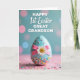 This design shows a light teal, egg-shaped treat resting on a blush-pink surface sprinkled with tiny confetti-like dots in soft pink, blue, yellow, and white 🌷. A pink ribbon wraps around the middle and is tied into a tidy bow, like a gentle hug that hints at close family affection. Centered on the bow sits a white daisy with a golden-yellow middle, adding a fresh, springy touch against the candy-like textures. The lower half of the egg is coated in dense, multicolored sprinkles, creating a rich, crunchy-looking band that catches the light. Behind it, the background shifts into a calm teal field with out-of-focus circles in pale pink and misty blue, giving the scene a dreamy glow 🐰. Across the upper area, white text reads “HAPPY 1st Easter GREAT GRANDSON,” with “HAPPY,” “GREAT,” and “GRANDSON” in thicker, simple lettering and “1st Easter” in a flowing cursive style. The words sit centered above the egg, standing out sharply against the teal backdrop with the soft bokeh dots floating around them.