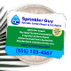 Simple vector logo in blue and green of lawn sprinkler spraying water on lawn enclosed in water drop outline.