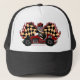 Fire red classic sprint car and driver backed by two crossed checkered flags on fire with a shield depicting a checkered flag and an American flag with the words “Speed Crazy” emblazoned on it.