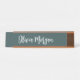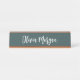 Elegant desk nameplate features your name, title, or choice of personalization in white hand scripted cursive lettering on a dark spruce green background.