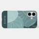 Modern boho style design features a background of organic shapes in muted shades of spruce green, overlaid with tropical monstera leaf illustrations. Personalize with a name or monogram along the bottom.