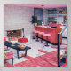 A photograph of a mid-twentieth century basement decorated in black, pink, and gray modern.