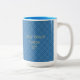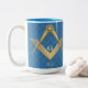 Stylish gold square and compass Masonic symbol personalized coffee mug with a blue plaid background.