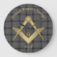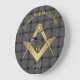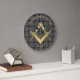 Masonic Square and Compass wall clock with a plaid background. Personalize the text with location and lodge number.