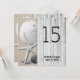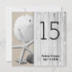 Double sided, square beach wedding table number cards. Numbers, names and wedding date are printed on both sides in black, over a gray wood (boardwalk) image with starfish , sand dollar and seashells in the sand.