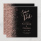 The left-hand edge of this elegant modern wedding save the date card features a rose gold faux glitter border. The customizable text combines pale rose gold blush colored handwriting, copperplate and italic fonts on a black background. The reverse side features a matching black and rose gold design.