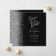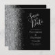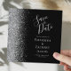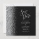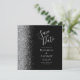 The left-hand edge of this elegant modern wedding save the date card features a silver faux glitter border. The customizable text combines silver gray handwriting, copperplate and italic fonts on a black background. The reverse side features a matching black and silver design.