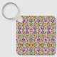 Square keychain showcasing a vibrant floral pattern with green leaves, pink and purple flowers on a beige background. The design evokes a cheerful, vintage feel.