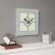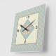 This Delicate Wall Clock features lacey cream medallions on light blue. The center is a largemedallion. The numbers are on a cream background. It is framed with small repeating medallions laid diagonally. The Medallion images come from tile by Oregon tile maker Fay Jones Day.