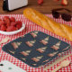 Stylish large square Christmas paper plate with a midnight blue background and festive red and green tree design. Perfect for serving main dishes at holiday parties. Pair with the small square and round plates for a coordinated Christmas set.