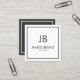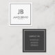A square double sided black and white business card. The front shows a white background with a black border, a monogram, your name and title. The back of this minimalist design has a black or dark grey background with a white border, as well as your contact information. This modern and elegant business card design is ideal for professionals and individuals who like minimal clean design.