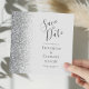 The left-hand edge of this elegant modern wedding save the date card features a silver faux glitter border. The customizable text combines charcoal gray handwriting, copperplate and italic fonts on a pale gray background. The reverse side features a matching pale gray and silver design.
