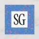 A square business card template with initials placed inside a square panel. This version also has a background image. The initials are in the Integrity bold font. Name and profession/job title along with telephone, email and website address in black on the reverse side on a white background, using variations of the Matt Antique font.